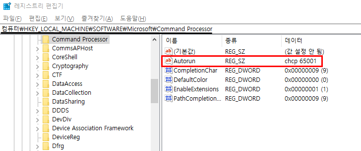 (2) 레지스트리에서 Autorun 문자열 값을 chcp 65001 로 수정한다.