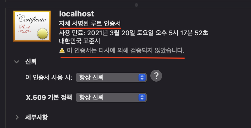 이는 인증서를 발급한게 제 3의 외부 기관이 아니라 (개발자가 임의로 설정한) 'localhost' 로 셀프 인증을 했기 때문이다.
