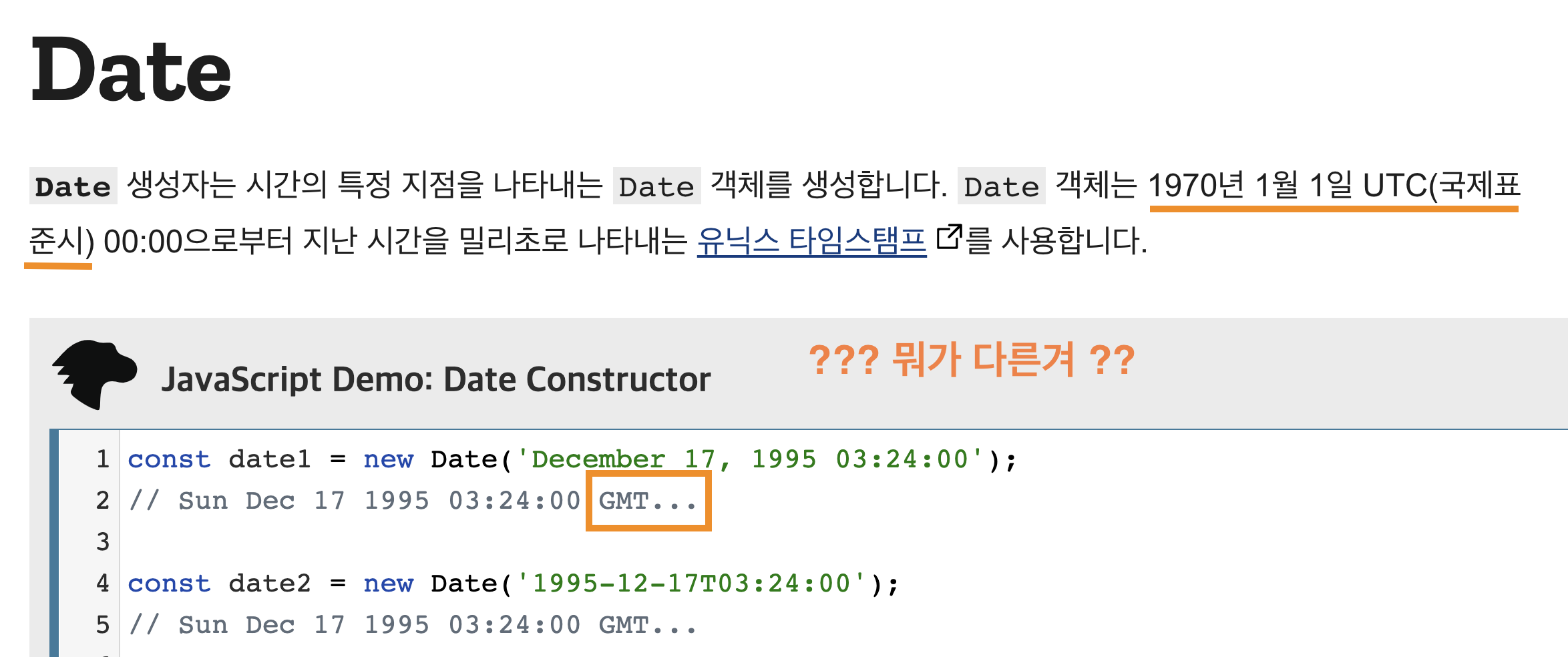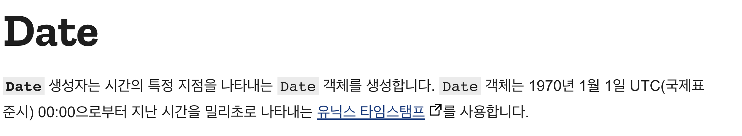 Date Date 생성자는 시간의 특정 지점을 나타내는 Date 객체를 생성합니다. Date 객체는 1970년 1월 1일 UTC(국제표준시) 00:00으로부터 지난 시간을 밀리초로 나타내는 유닉스 타임스탬프를 사용합니다.