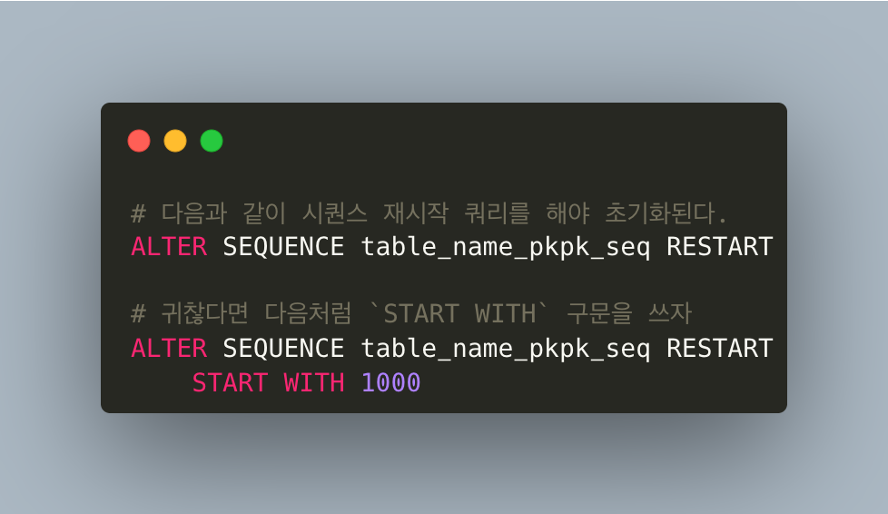 👉🏻 현재 시퀀스 값에는 아무런 영향을 주지 않으므로 `ALTER SEQUENCE RESTRT` 를 사용하라