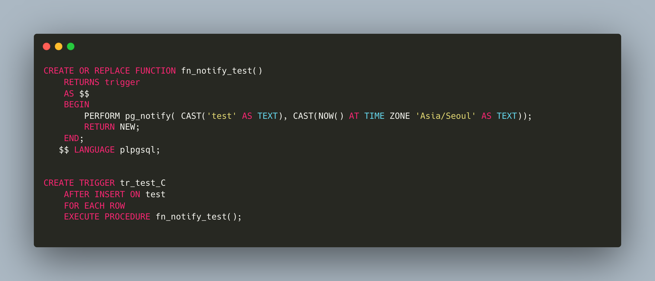 <test> 테이블에 pg_notify 트리거 함수와 트리거를 설정한다.