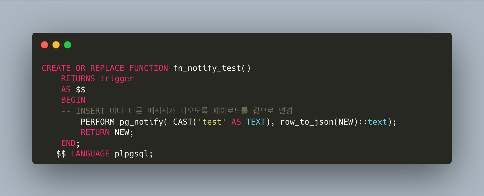 ex) Node.js 에서 PostgreSQL 에서 발생한 특정 이벤트 페이로드를 받아온다.