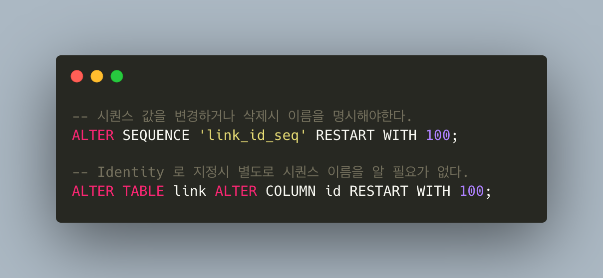 또, SQL Standard 에도 맞지 않기 때문에 PostgreSQL 10버전부터 Identity 를 사용하기로했다.