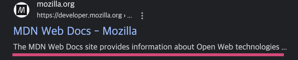 위 결과에서 title 은 `MDN Web Docs` 고 description 의 content 값이 "The MDN Web Docs site provides information about Open Web technologies ..." 이다.