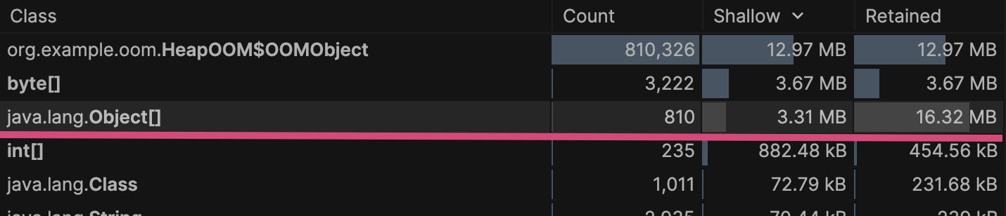 ์ ์์ ์์ OOMObject ๊ฐ์ฒด 810,326 ๊ฐ๊ฐ 12.97MB Shallow ๋ก ๊ฐ์ง๋ค.