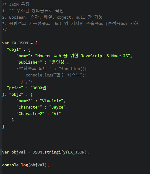 JSON은 객체, 배열, 숫자, 문자열, 불리언과 null을 직렬화하기 위한 구문으로, JavaScript 구문에 기반을 두고 있지만 분명한 차이점을 가지고 있습니다. 즉, 어떤 JavaScript는 JSON이 아닙니다 -- 출처: MDN